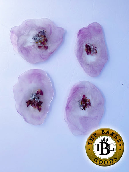 (4) Resin Coasters Infused With Rose Buds, Crystal Quartz and Rose Quartz